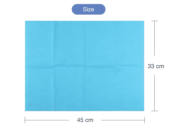 ج: يبلغ حجمها 45 × 66 سم، وهو حجم كبير بما يكفي لتوفير تغطية شاملة لكل من المرضى البالغين والأطفال أثناء علاج الأسنان، مما يحمي ملابسهم والمنطقة المحيطة.